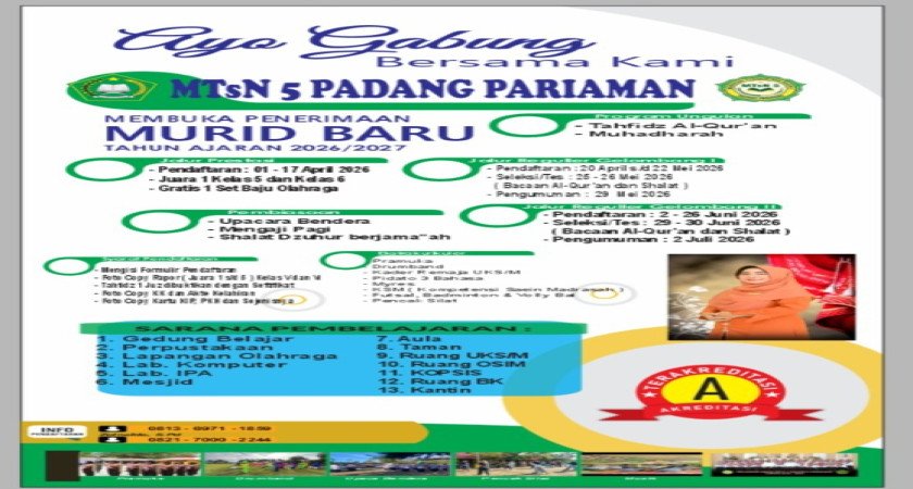 MTsN 5 Padang Pariaman (Terakreditasi A) membuka Penerimaan Murid Baru TP 2026/2027. Nikmati fasilitas belajar lengkap, mulai dari Lab Komputer hingga sarana olahraga yang memadai.